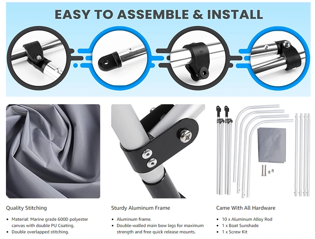Хөнгөн цагаан завины халхавч. Хийлдэг завь, завь, завь, загас агнуурын завь зэрэгт тохиромжтой. Манай завины сүүдэр нь таныг нар, борооноос хамгаалдаг бөгөөд Runabout завь, V-Hull завь, Жон завь, басс завь, хийлдэг завь, шилэн завь, Zhejiang Jiayu Outdoor Products Co., Ltd эд ямар нэгэн онцгой зүйлгүйгээр хэдхэн минутын дотор хийж дуусгах боломжтой. хэрэгслүүдийг ашиглан та үүнийг хялбар бөгөөд хурдан суулгах боломжтой.